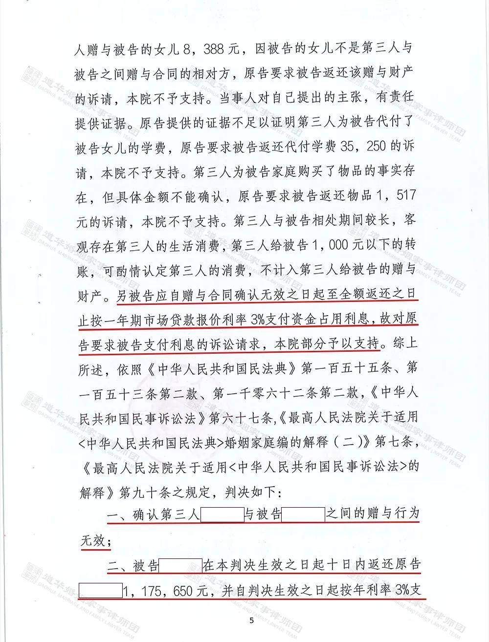 导语:婚姻关系存续期间,夫妻共同财产是维系家庭稳定的重要基础。然而,张女士却遭遇了丈夫长达十余年的婚外情,且丈夫在这段时间内擅自将夫妻共同财产上百万元转账给第三者,并为其购置房产,严重侵害了张女士的合法权益。在多次沟通无果后,张女士毅然委托唐云虹律师代理此案,寻求法律帮助。唐云虹律师接受委托后,迅速投入工作,全面收集证据以还原案件事实,并及时采取财产保全措施冻结第三者名下房产,最终凭借专业的法律素养和严谨的诉讼策略,成功促使法院支持张女士的诉求,判令第三者返还117万元及利息,为张女士挽回了重大财产损失。