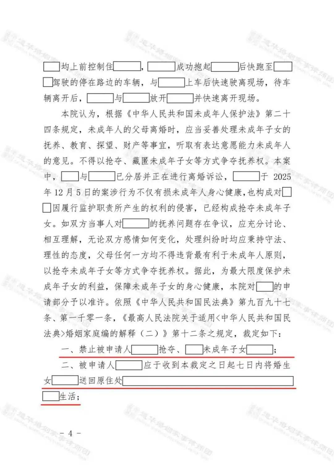 深圳市南山区人民法院经审查认定,梁女士于2025年12月5日的涉案行为不仅有损未成年人身心健康,也构成对陈先生因履行监护职责所产生的权利的侵害,已经构成抢夺未成年子女。并依法作出民事裁定书: